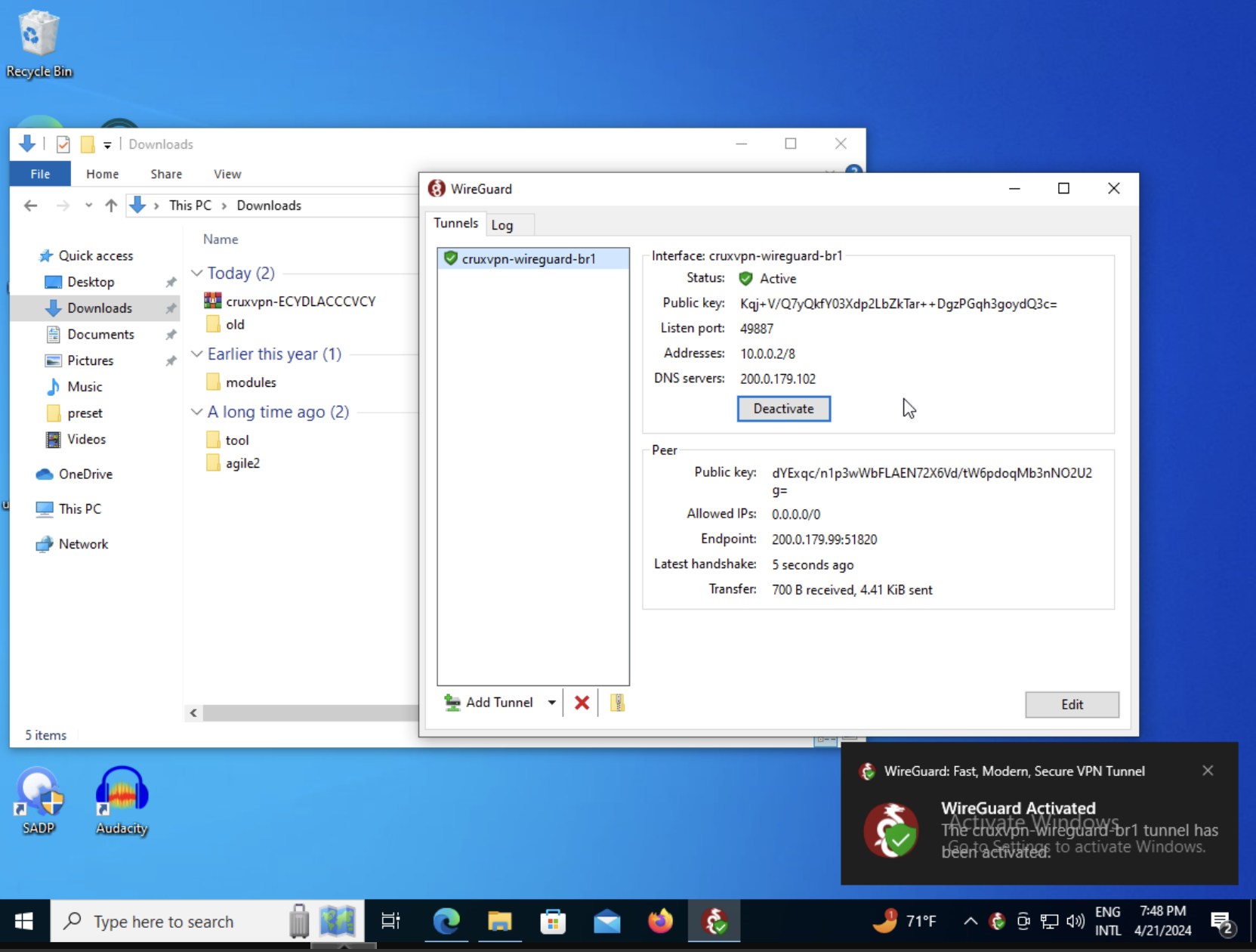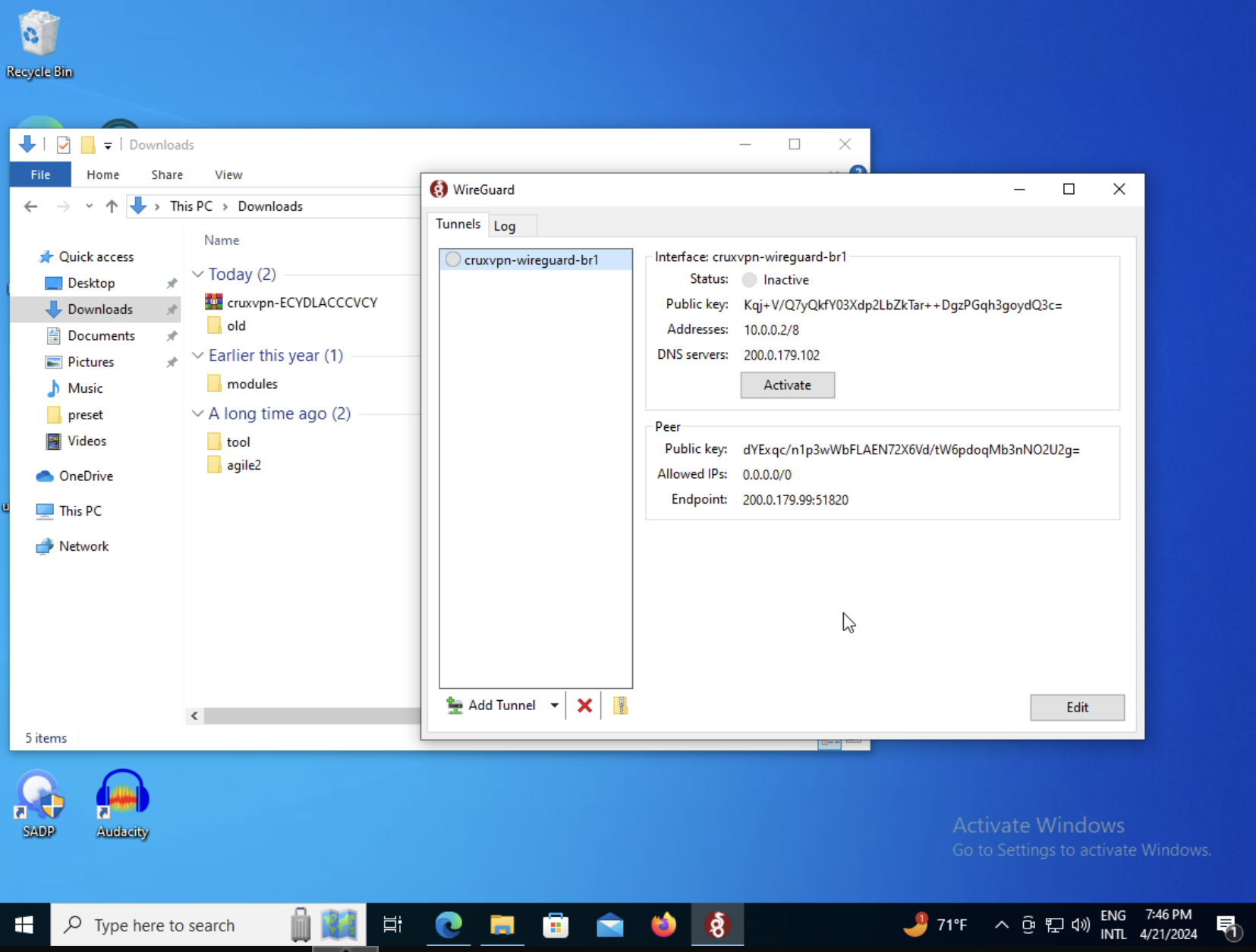 Step 07 - Click in a cruxvpn-wireguard tunnel and Click in 'Activate' Button